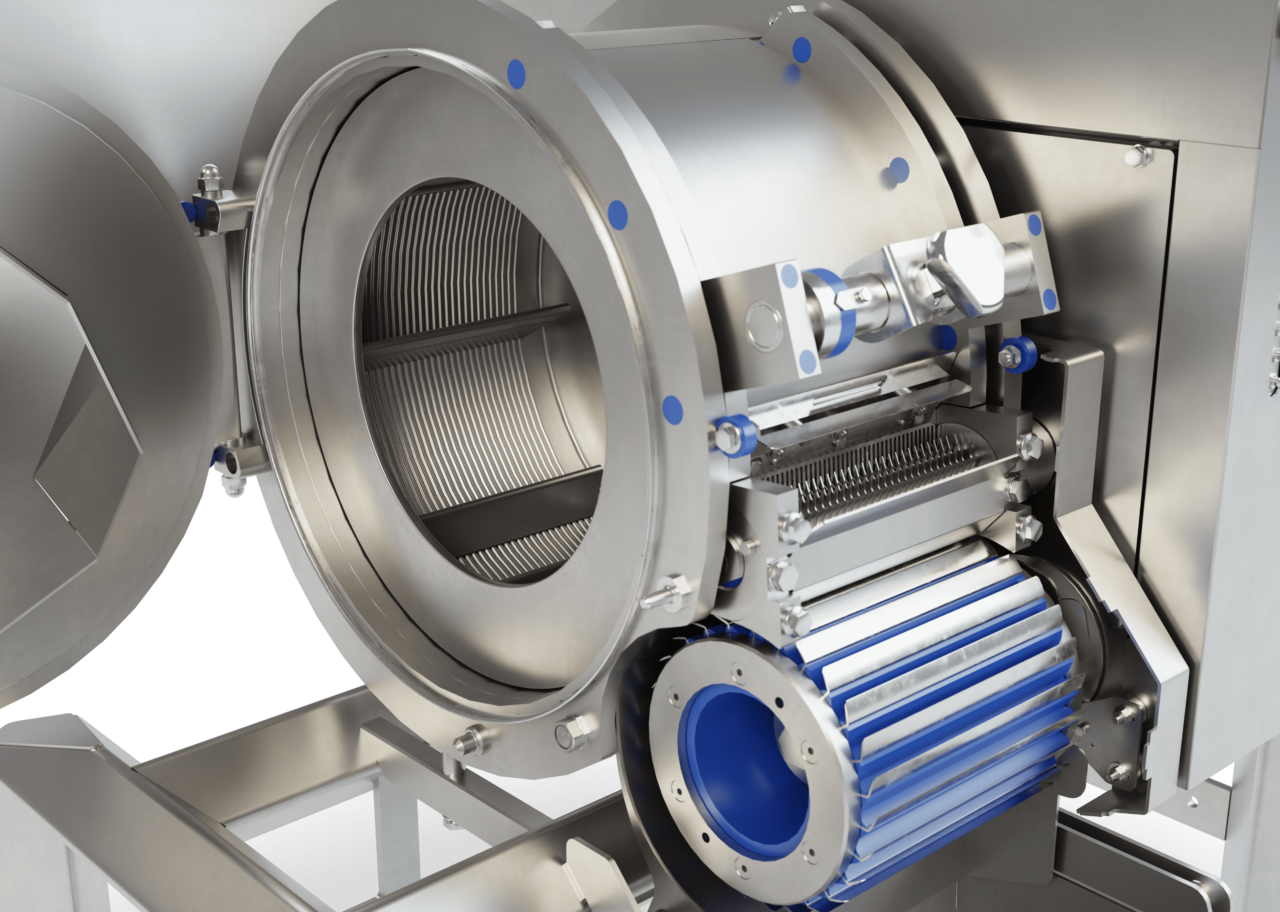 Merkezkaç kuvveti, ürünü tamburun iç duvarına bastırırken, tambur kanatçıkları ürünü dilimleme bıçağından önünden geçirir.