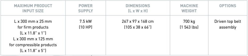 • Tahrikli üst bant, ürünün kesici takımlara pozitif şekilde aktarılmasını garanti edecek şekilde özel olarak tasarlanmıştır. Bu tasarım kesim kalitesini büyük ölçüde artırır ve ürün kırılmalarında önemli azalma sağlar.